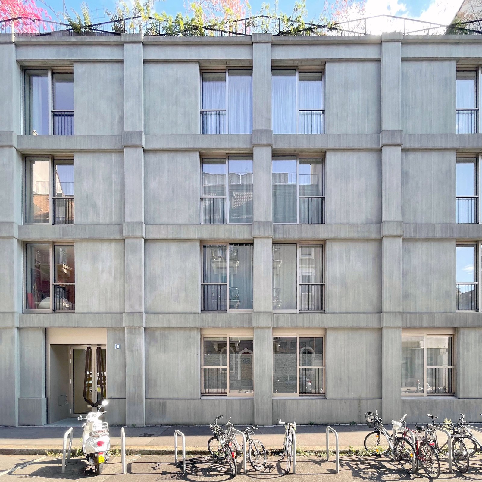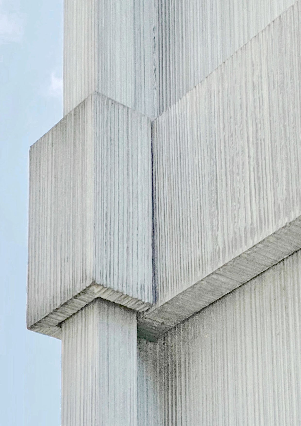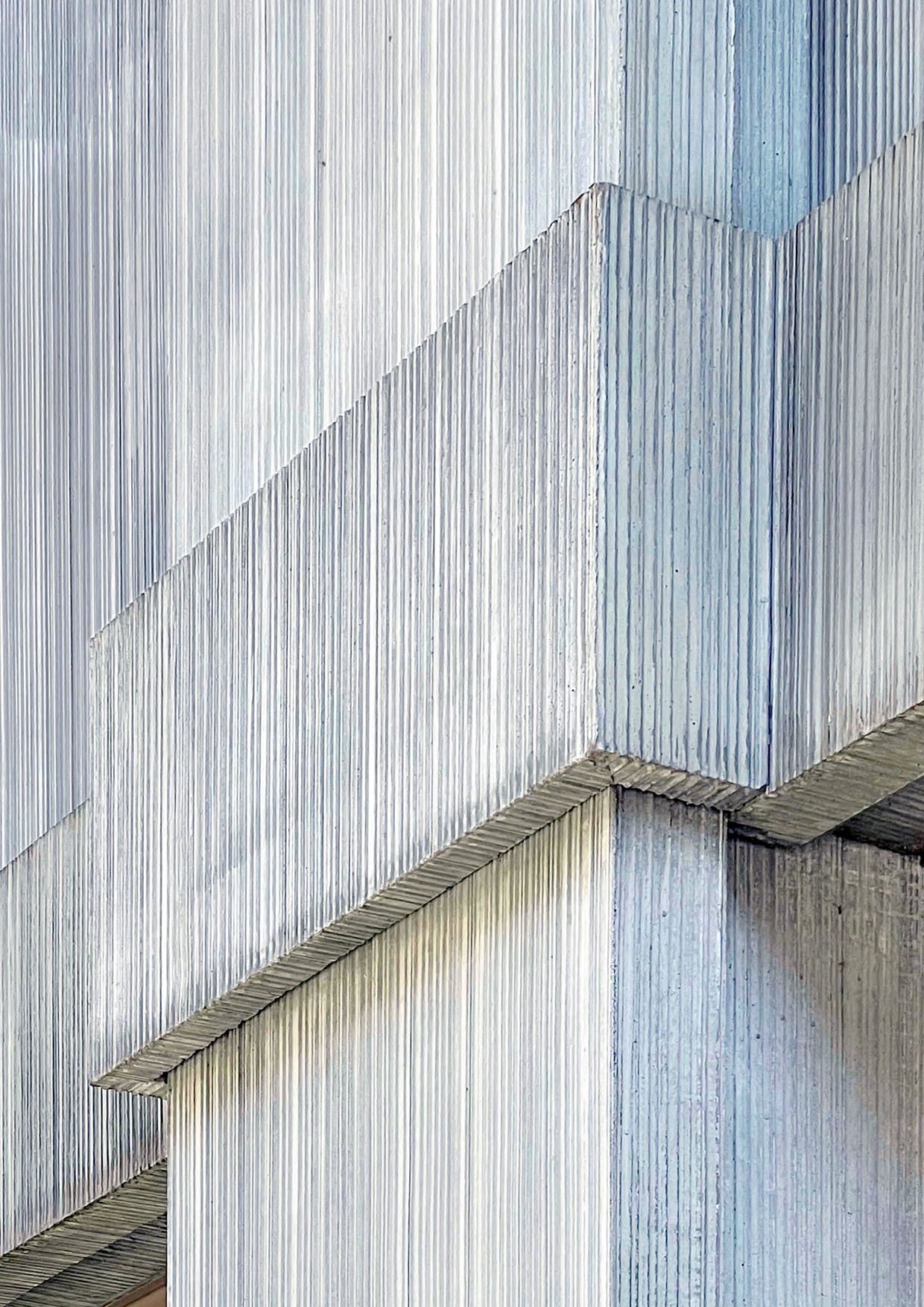 Beim Umbau des Bürogebäudes in ein Wohnhaus mit einundvierzig Wohnungen wurde die Fassade an die veränderte Gebäudestruktur und aktuelle energetischen Anforderungen angepasst. Die Gestaltung wird bestimmt duch dünnwandige Elemente aus Glasfaserbeton, die Stützen und Betondecken des entkernten Bestands neu bekleiden. Die feine Riffelung der Elementoberflächen und die Überblattung der Fugen betonen den textilen Charakter des neuen Fassadenkleids. Entwurf und Konstruktion der Fassade erfolgte in freier Mitarbeit für Demuth Hagemüller & Lamprecht Architekten.